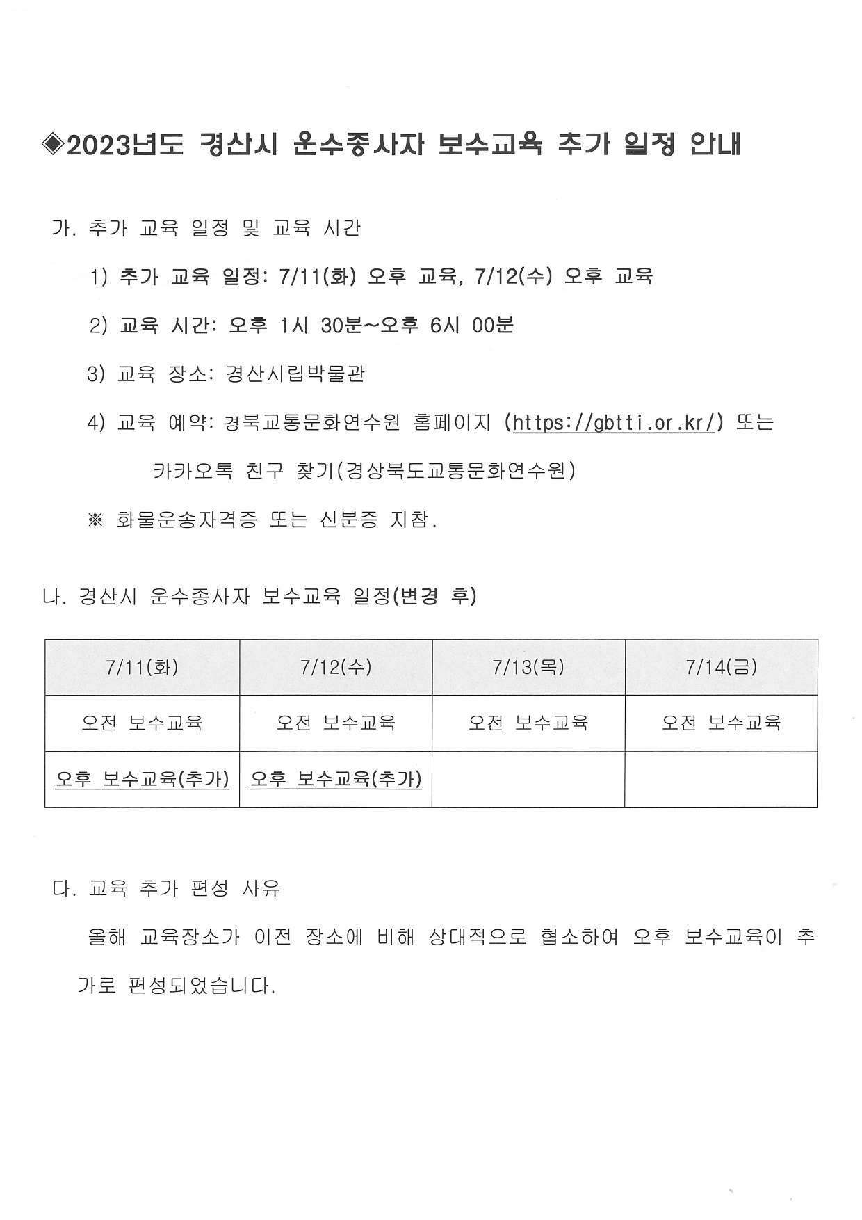2023년도 경산시 운수종사자 보수교육 추가 일정 안내